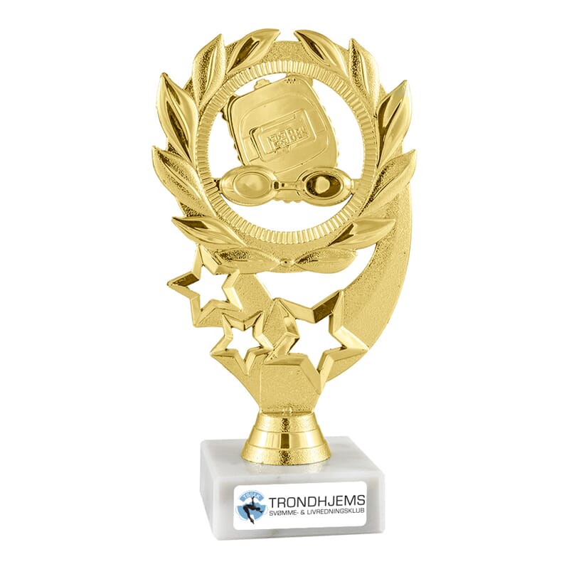 Ny flott svømme statuett. Prisen er inkl. eget vinylmotiv med logo og lik tekst. Min. antall 100 stk.