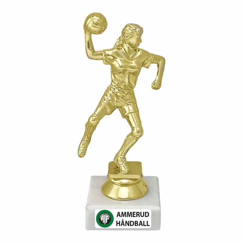 Håndball statuett dame på marmorfot. Populær og prisgunstig deltakerpremie. Prisen er inkl. eget vinylmotiv med logo og lik tekst . Min. antall 100 stk.