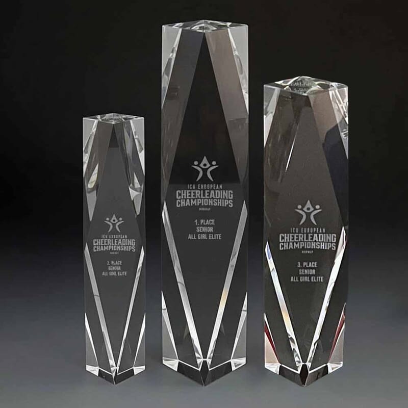 Krystall premie. Blir levert i sort gaveeske. Sandblåst tekst og logo.